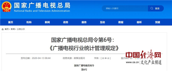 《廣播電視行業(yè)統計管理規定》已經(jīng)2020年3月20日國家廣播電視總局局務(wù)會(huì )議審議通過(guò),現予公布,自2020年5月5日起施行。