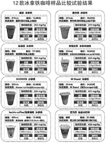 相比而言,12款冰拿鐵咖啡樣品的糖含量、脂肪、能量的檢測數值比冰美式咖啡樣品要高,但12款冰拿鐵咖啡樣品的糖含量均達到標準的“低糖”要求。