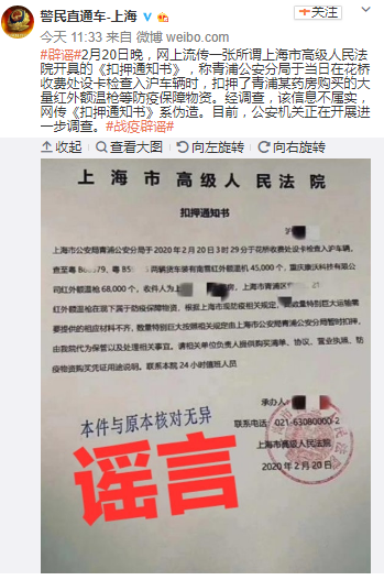 經(jīng)濟日報-中國經(jīng)濟網(wǎng)2月22日訊 (記者 朱國旺 郭文培) 2月20日晚,網(wǎng)上流傳一張所謂上海市高級人民法院開(kāi)具的《扣押通知書(shū)》,稱(chēng)青浦公安分局于當日(20日)在花橋收費處設卡檢查入滬車(chē)輛時(shí),扣押了青浦某藥房購買(mǎi)的大量紅外額溫槍等防疫保障物資。