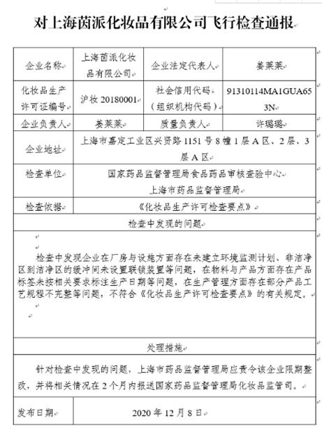 飛行檢查報告顯示,在檢查中發(fā)現上海茵派化妝品有限公司在廠(chǎng)房與設施方面存在未建立環(huán)境監測計劃、非潔凈區到潔凈區的緩沖間未設置聯(lián)鎖裝置等問(wèn)題,在物料與產(chǎn)品方面存在產(chǎn)品標簽未按相關(guān)要求標注生產(chǎn)日期等問(wèn)題,在生產(chǎn)管理方面存在部分產(chǎn)品工藝規程不完整等問(wèn)題。