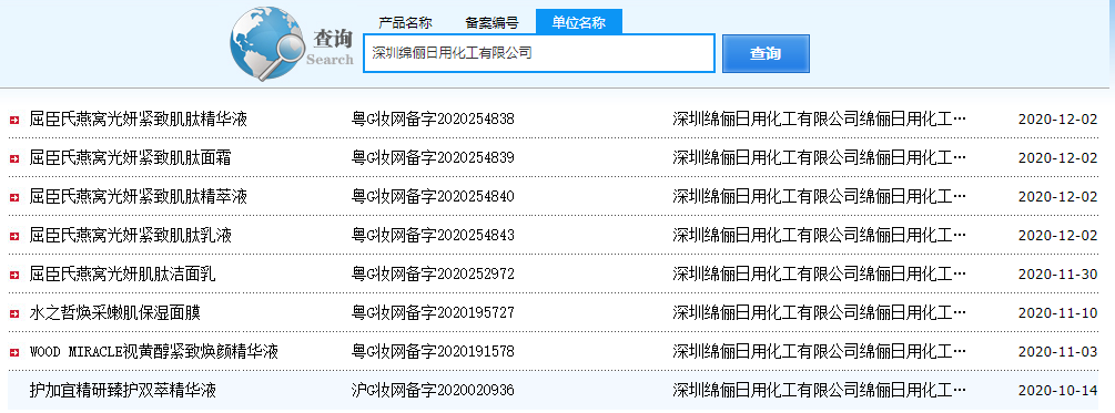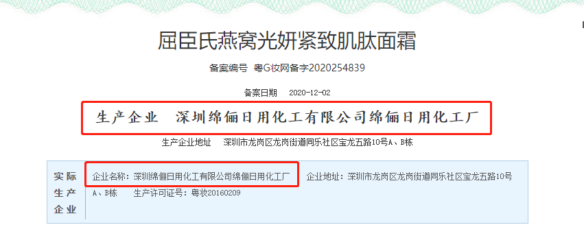 記者通過(guò)國產(chǎn)非特殊用途化妝品備案平臺查詢(xún)得知,深圳綿儷日用化工有限公司是屈臣氏燕窩光妍緊致肌肽精華液、歐薇蔻肌肽水光晶致面膜、護加宜精研臻護雙萃精華液等800多款產(chǎn)品的生產(chǎn)企業(yè)。