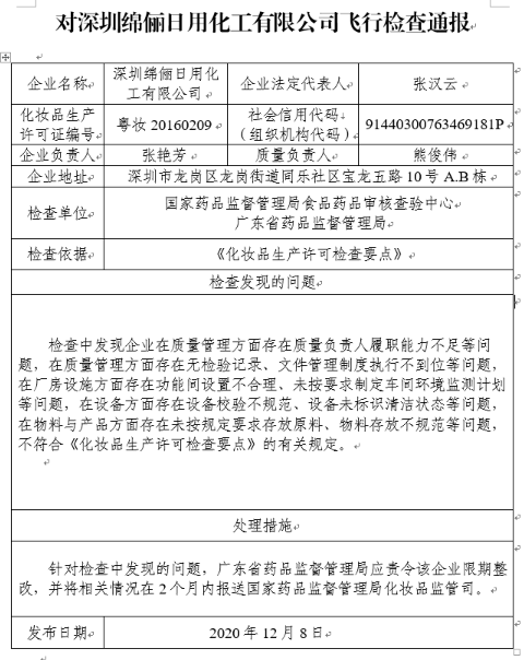 針對檢查中發(fā)現的問(wèn)題,國家藥監局要求廣東省藥品監督管理局應責令深圳綿儷日用化工有限公司限期整改,并將相關(guān)情況在2個(gè)月內報送國家藥品監督管理局化妝品監管司。